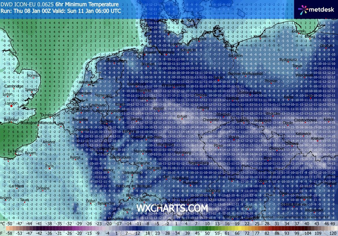 Obr. 4: Minimální teploty během nedělního rána ve střední Evropě. Zdroj: WXcharts.com