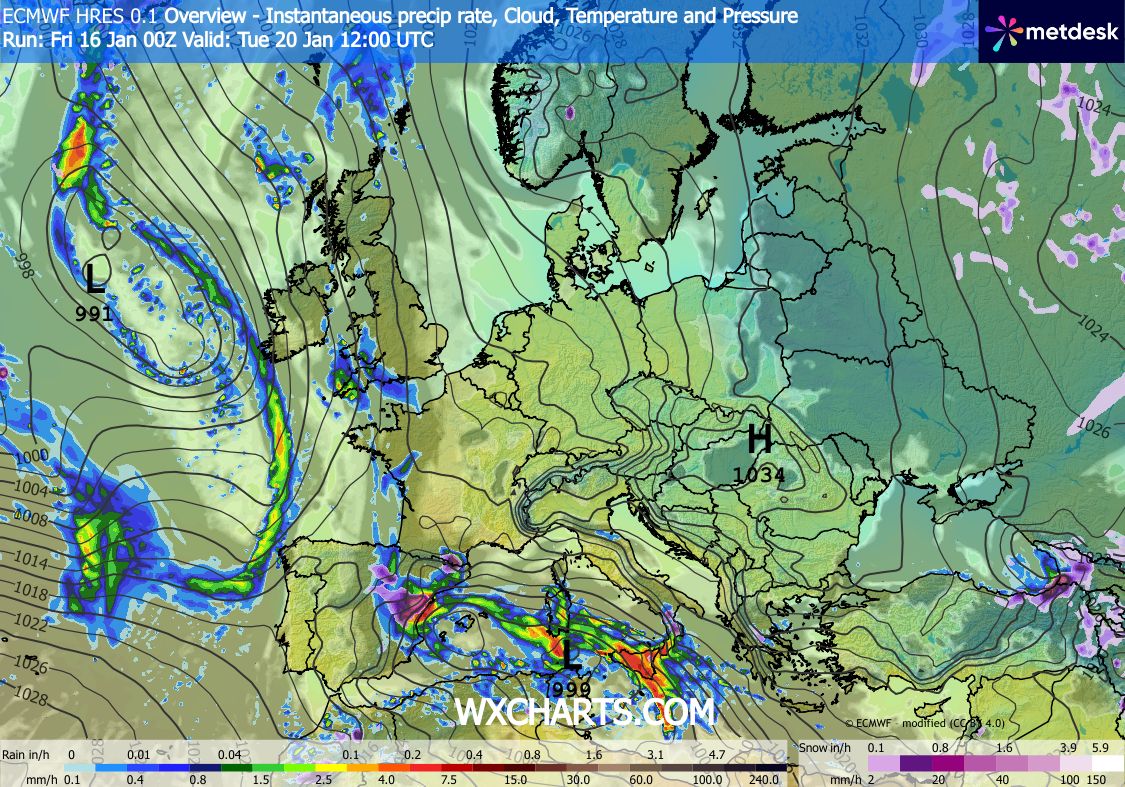 Obr. 5: Výstup modelu ECMWF je typickým příkladem nástroje užívaného pro střednědobou předpověď (zdroj: WXCharts.com/Metdesk)